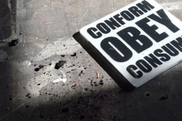 TEXT TILES at the Notional Defective exhibition "This is not the Turner Prize", Drury Gallery, Glasgow. Conform. Obey. Consume.