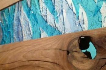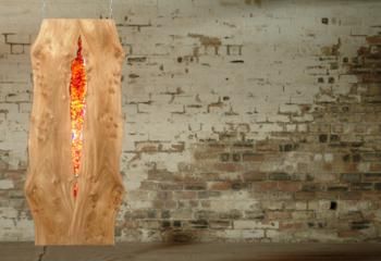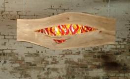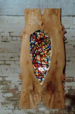 Elm and Glass wallhangings. A series of sculptures were made for a Studio Exhibition, 2005. Made in collaboration with Scottish artist Alan Cruikshank of Cambium Creations they are approximately 2.5m in length and can be fixed directly to the wall and backlit, or can hang from chains and be lit naturally. The trees were sourced locally (Wind felled, Mugdock Country Park).