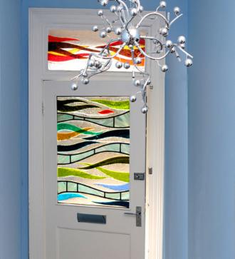 Fused glass and leaded glass door panel and transom light. (Hand blown St.Just glass and English antique glass).