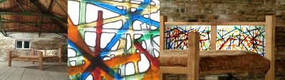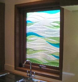 (L) Fused glass wave design kitchen window. Dalry, Scotland.