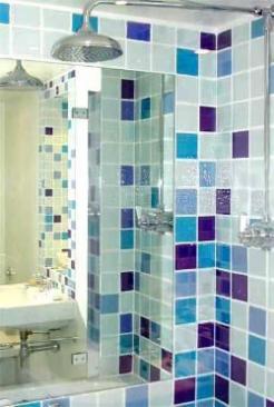 Single colour. Dark blue, Light blue, turquoise and white fused glass tiles. Bathroom. Glasgow.