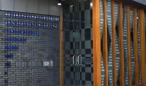 Fused glass tile wall inserts for Architect David MacRitchie, Artist Martin McInally, and Fleming Buildings Ltd for the new entrance at the business headquarters for TUV NEL, East Kilbride.