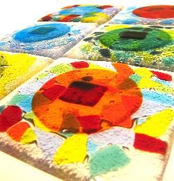 Fused glass tiles can be made from 40mm to 1000mm. They can be 3mm thick to 12mm. Single or multi coloured. Any design. Any shape. Any texture. End strips / borders can be made to order. Glass tiles can be used in bars, nightclubs, bathrooms, kitchens, swimming pools and for designing outdoor mosaic art. Glass tiles can also be used as coasters.