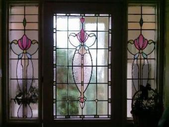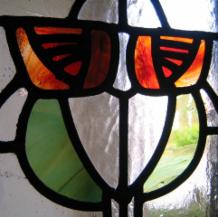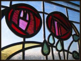 Left. Stained glass detail. Glasgow Rose. Middle section of 15 small panels which made up this glasgow front door.