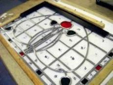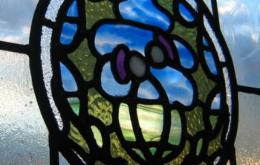 This stained glass window was designed using elements of local relevance to the client, local maps and to the windows of Frank Lloyd Wright. Details from the clients own photography were painted into small sections of the glass. The white Lamberts glass turns to a light amber when viewed directly into light.