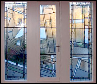 Stained glass front door and windows for this East Kilbride home. Designs taken from architects drawings. ATA Studio. 2009 Glasgow Institute of Architects design commendation.
