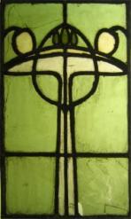 Stained Glass Architectural Salvage. Glasgow. The panels above show some of what can be done in re-using existing panels. The client bought two panels with the same design from the salvage yard (left) which we joined together and made slightly bigger for a transom light in this Glasgow home. All the original glass was kept and a similar type was used for the extensions.