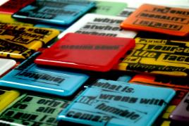 Fused glass detail from a lightbox and fused glass tiles with painted and kiln fired text. See more fused glass tiles in the Tile section