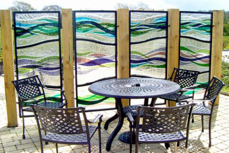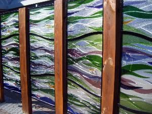 Five fused glass panels curved to make a screen in the communal garden courtyard at Fairhill, Hamilton. South Lanarkshire Lifestyles Fairhill is a multi-purpose community centre. 15 wave design fused glass panels making up 5 sections, Approx .8m x 2m. Each panel incorporated hand prints moulded into the glass
